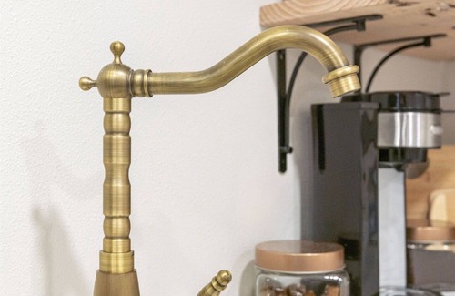 Walk-in shower, antique brass fixtures, and endless hot water via tankless heater.