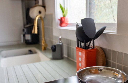 The kitchenette is equipped with 2-burner stove top, airfryer, mini-fridge with a freezer, microwave, toaster, French press, and electric kettle. All cookware items including utensils, pots, pans, dishes, and some spices are provided for your convenience. The host will also provide coffee, clean towels, toilet paper, paper towels, as well as toiletries such as soap, shampoo, and conditioner. A blow dryer, iron, and ironing board are also available for use.
