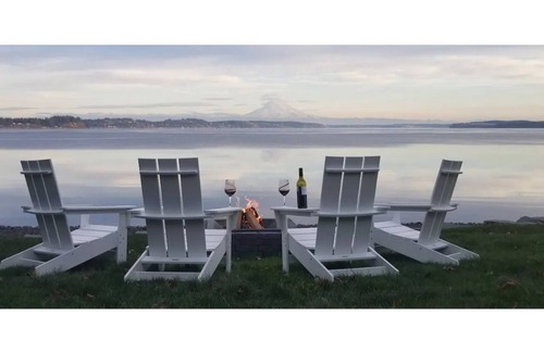 Welcome to Five Peaks Cottage. Stunning views of Mt. Rainier and Puget Sound. The cottage and companion pirate ship tree house are steps from the shore where you can enjoy swimming, kayaking, and leisurely beach walks. Loft bedroom, 1 1/2 baths, well equipped kitchen, wifi, large deck w/ hot tub, BBQ, bar. Fire pit and lawn at waters edge. On 23 acre horse farm with 510 feet of private beach and 1 1/2 miles of walking trails. Relax, enjoy eagles, blue heron, seals and an occassional Orca.