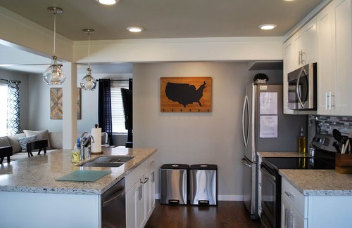 The kitchen has quartz counters, dishwasher, microwave, and all the dishes and cookware you will need. The home is equipped with 2 flat screen TVs, cable, BlueRay player, WIFI, linens, towels and a washer/dryer for your use. There is a large fully fenced back yard for summer entertaining.