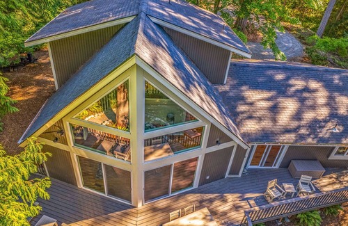 Once inside, you'll walk into a open-concept great room with a vaulted ceiling and floor-to-ceiling windows overlooking the wrap-around deck and Filucy Bay, as well as the meticulously designed, Pacific Northwest landscape with stone pathways and stairs to the water.
