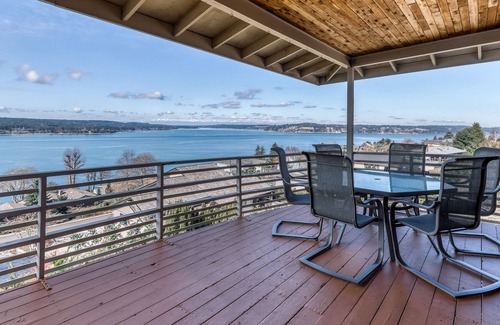 Offering multiple decks with 180-degree, sweeping views of the Olympic Mountains, Puget Sound, and Fox Island, this sparkling getaway, tucked away in a quiet, upscale neighborhood, is a great jumping off point for your next vacation in the Pacific Northwest. This rental features a full, updated kitchen, two separate living areas, and a furnished and covered deck where you can dine outdoors and take in the spectacular view.
