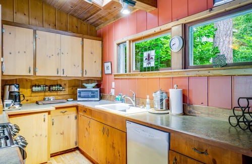 The living room has wall-to-wall windows that let you admire marvelous views of Mt. Rainier, Fox Island, and Hale Passage's sparkling waters. It's complete with comfortable furniture, partial A/C, and a telescope so you can admire the views from a closer look. This area opens onto a large waterside deck with two beach chairs, an outdoor dining area, a hammock, Adirondack chairs, and a gas grill–just the perfect setting for barbecues. There is a short path and a flight of stairs from the deck down to the bulkhead and pristine pebble beach.